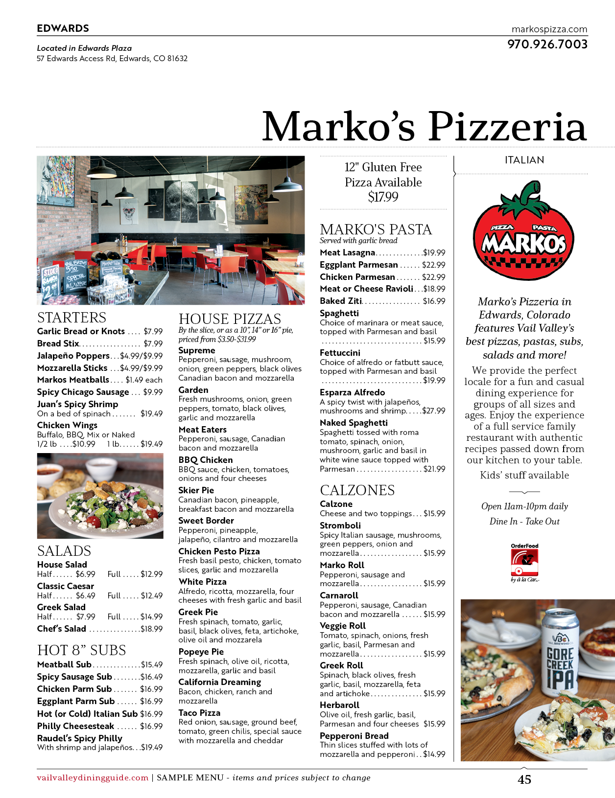 Marko’s Pizzeria in Edwards, Colorado features Vail Valley’s best pizzas, pastas, subs, salads and more!