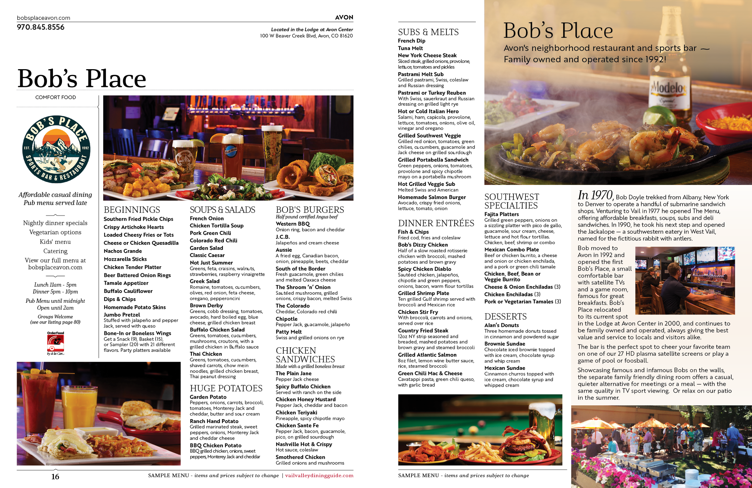Bob moved to Avon in 1992 and opened the first Bob’s Place, a small comfortable bar with satellite TVs and a game room, famous for great breakfasts. Bob’s Place relocated to its current spot in the Lodge at Avon Center in 2000, and continues to be family owned and operated, always giving the best value and service to locals and visitors alike.