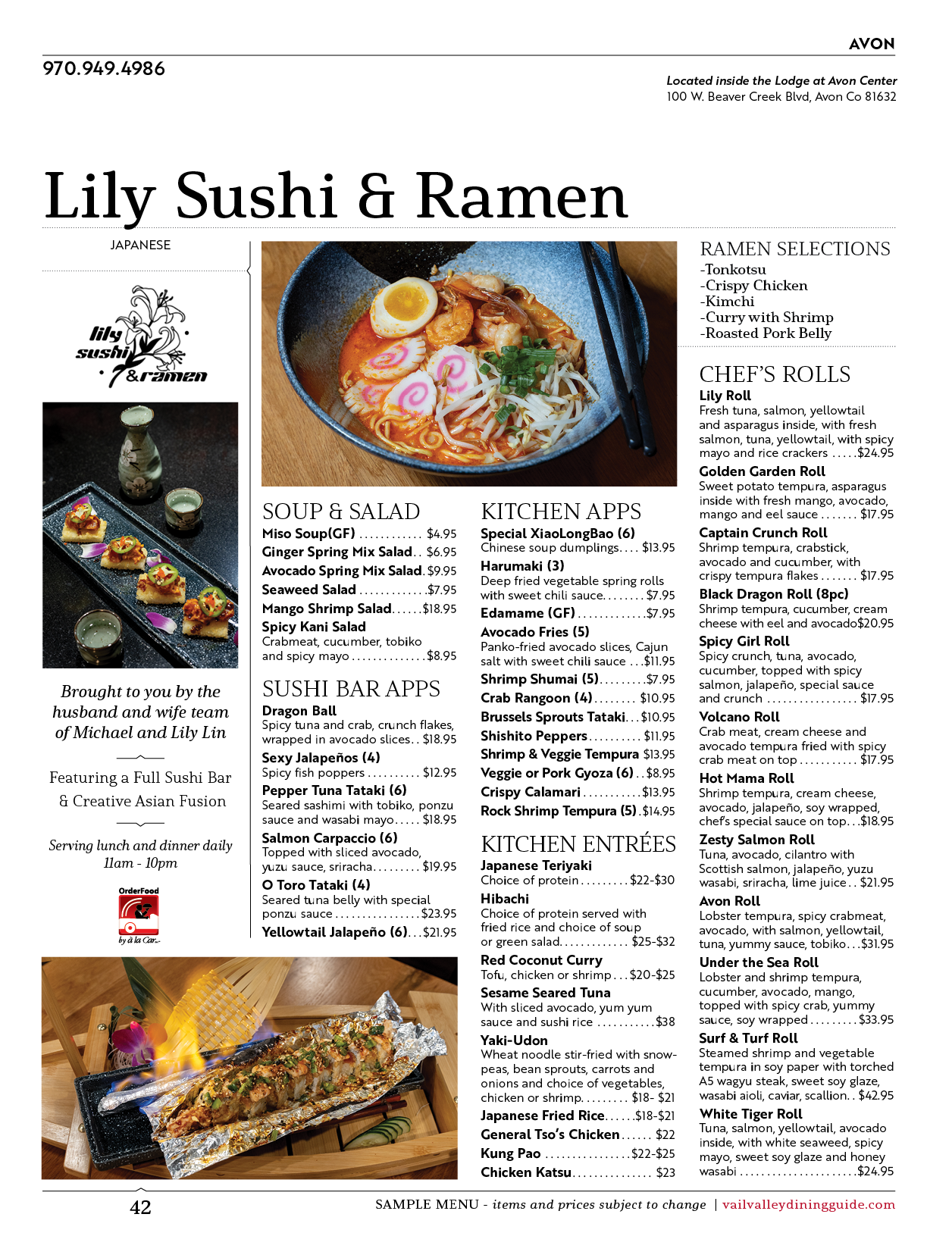 Lily Sushi & Ramen Avon Restaurants May 28 Written By Ariel Krawczyk Brought to you by the husband and wife team of Michael and Lily LinFeaturing a Full Sushi Bar & Creative Asian Fusion • Serving lunch and dinner daily 11am - 10pm Order Delivery Avonchinesedeliveryasian Ariel Krawczyk