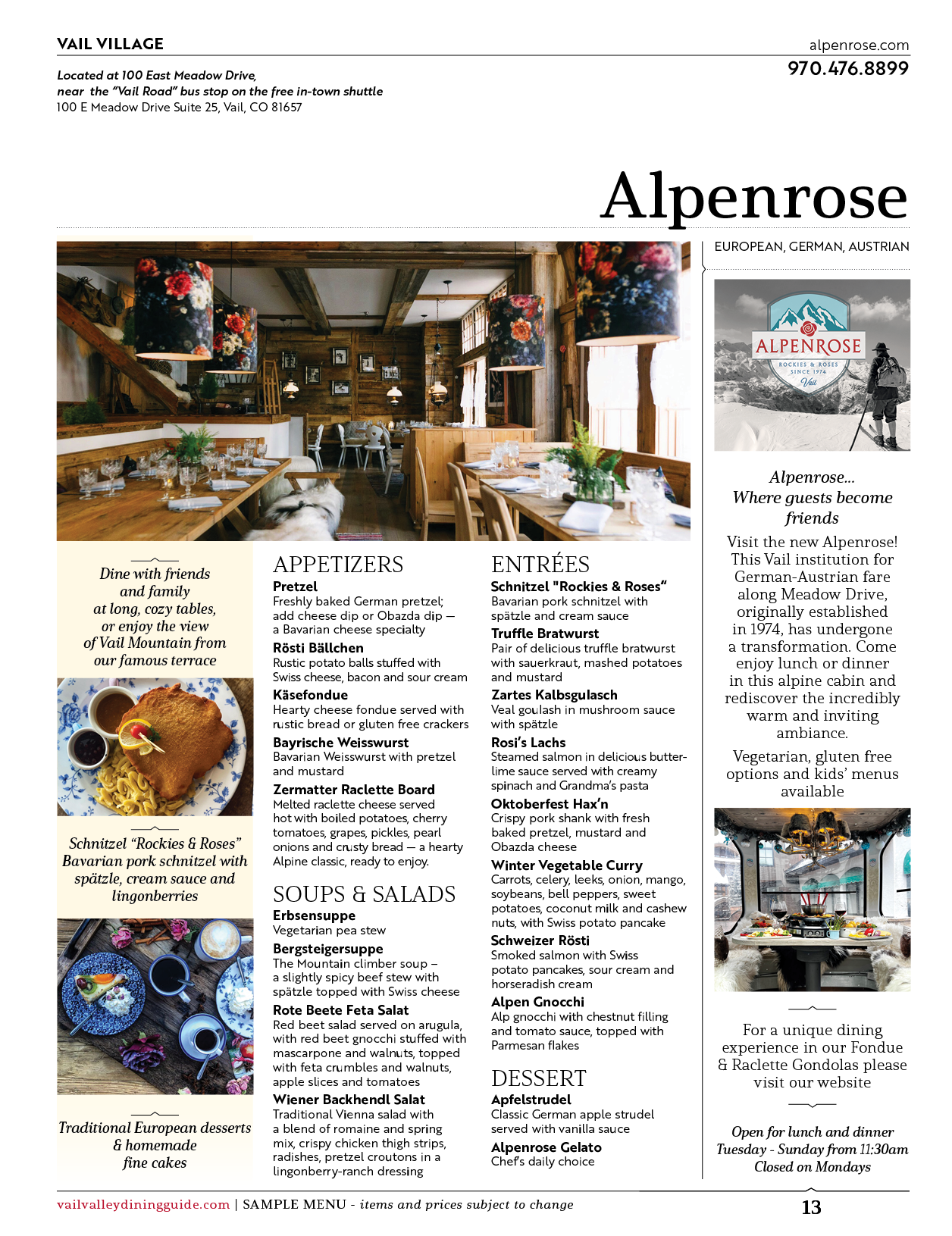 Visit the new Alpenrose! This Vail institution for German-Austrian fare along Meadow Drive, originally established in 1974, has undergone a transformation. Come enjoy lunch or dinner in this alpine cabin and rediscover the incredibly warm and inviting ambiance.