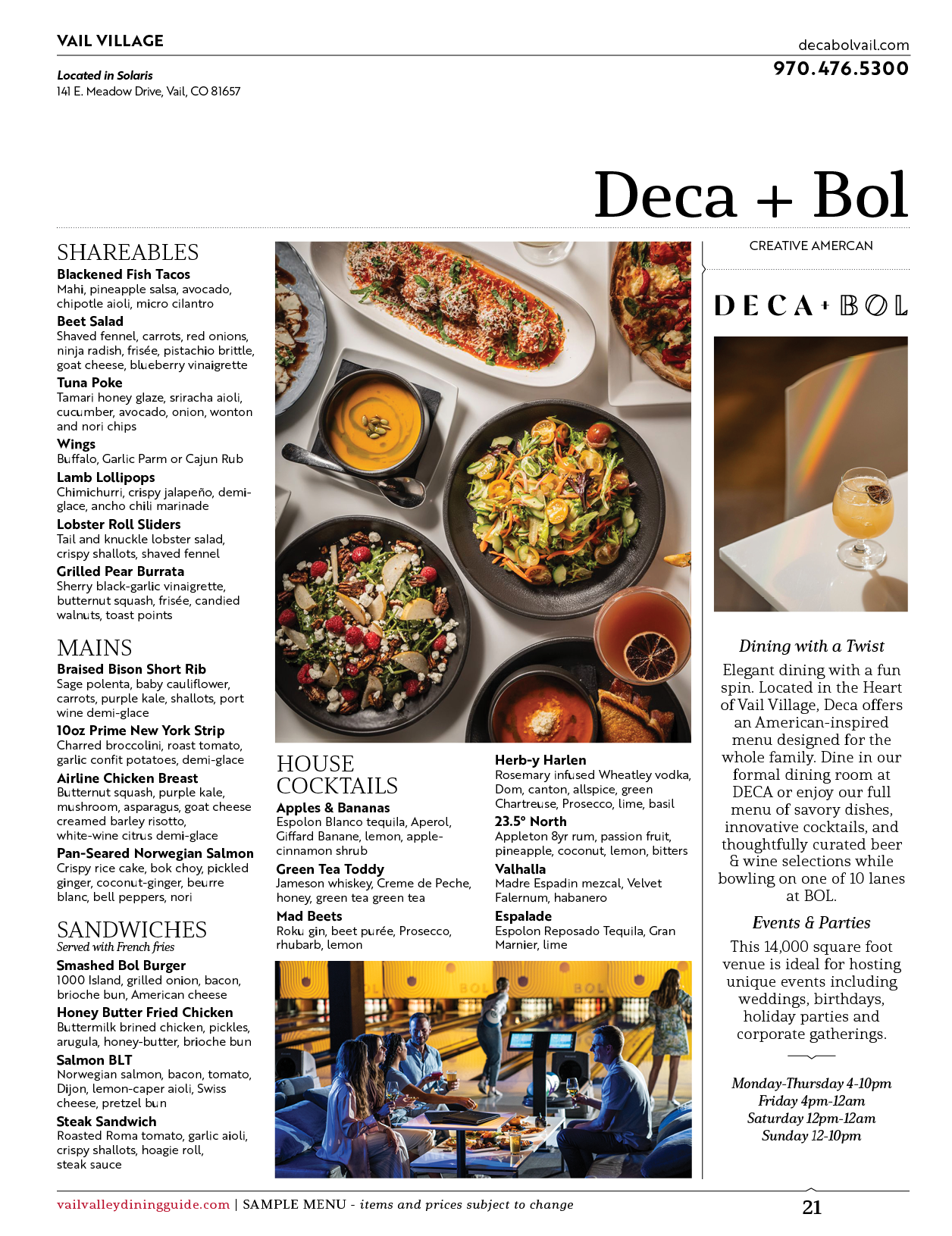 Elegant dining with a fun spin. Located in the Heart of Vail Village, Deca offers an American-inspired menu designed for the whole family. Dine in our formal dining room at DECA or enjoy our full menu of savory dishes, innovative cocktails, and thoughtfully curated beer & wine selections while bowling on one of 10 lanes at BOL.