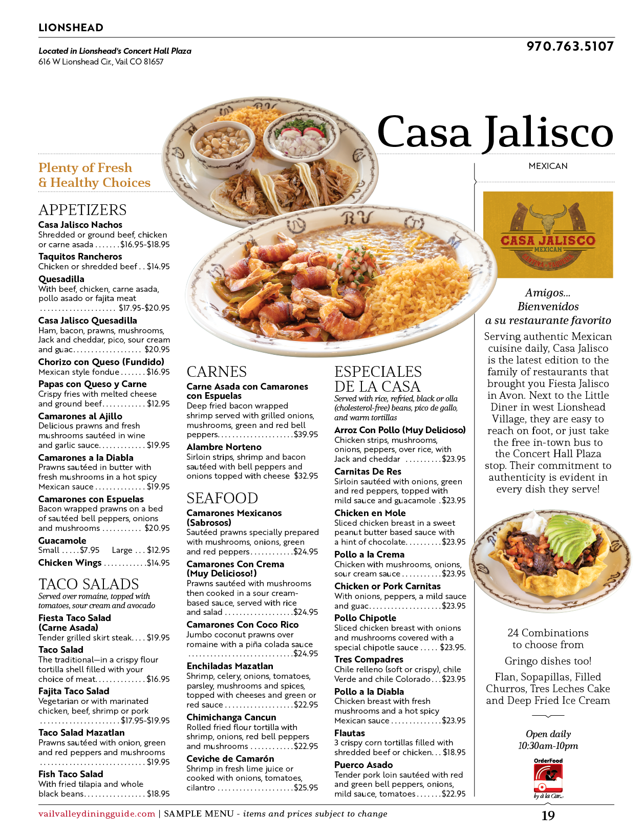Serving authentic Mexican cuisine daily, Casa Jalisco is the latest edition to the family of restaurants that brought you Fiesta Jalisco in Avon. Next to the Little Diner in west Lionshead Village, they are easy to reach on foot, or just take the free in-town bus to the Concert Hall Plaza stop. Their commitment to authenticity is evident in every dish they serve!