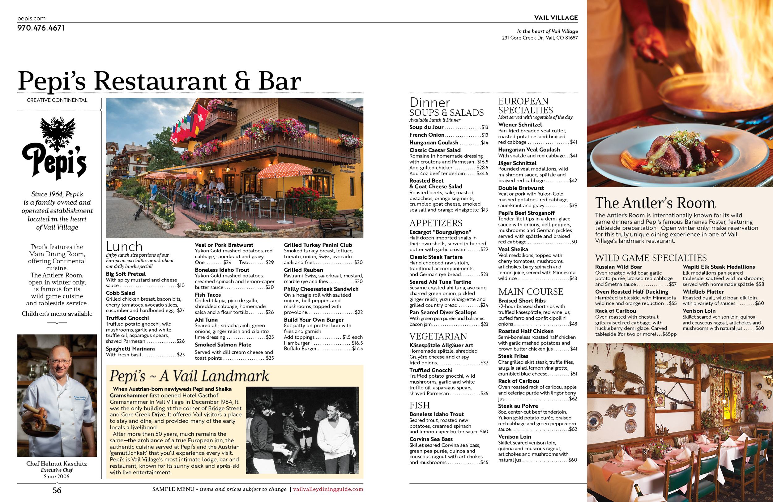 Pepi’s features the Main Dining Room, offering Continental cuisine. The Antlers Room, open in winter only, is famous for its wild game cuisine and table-side service.